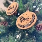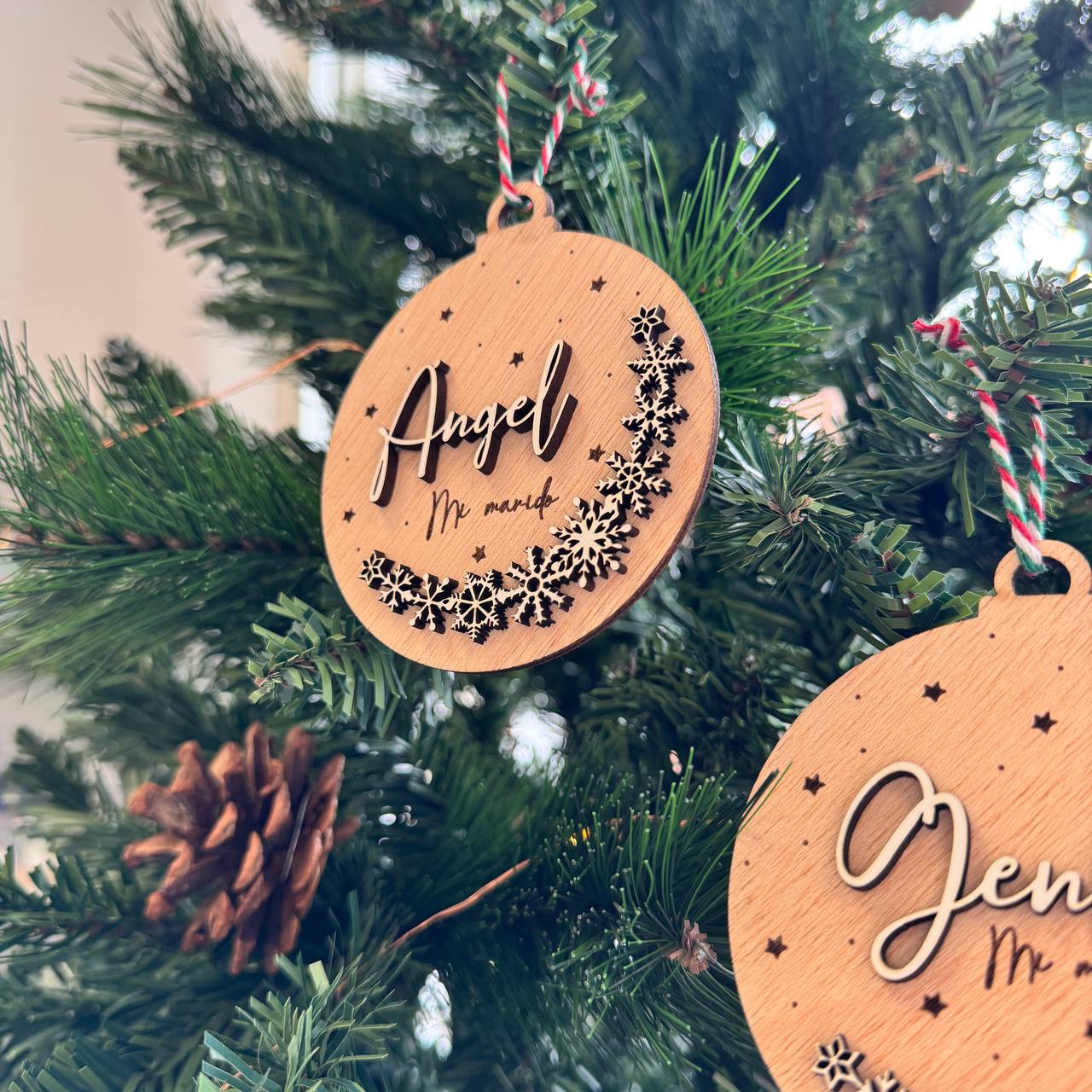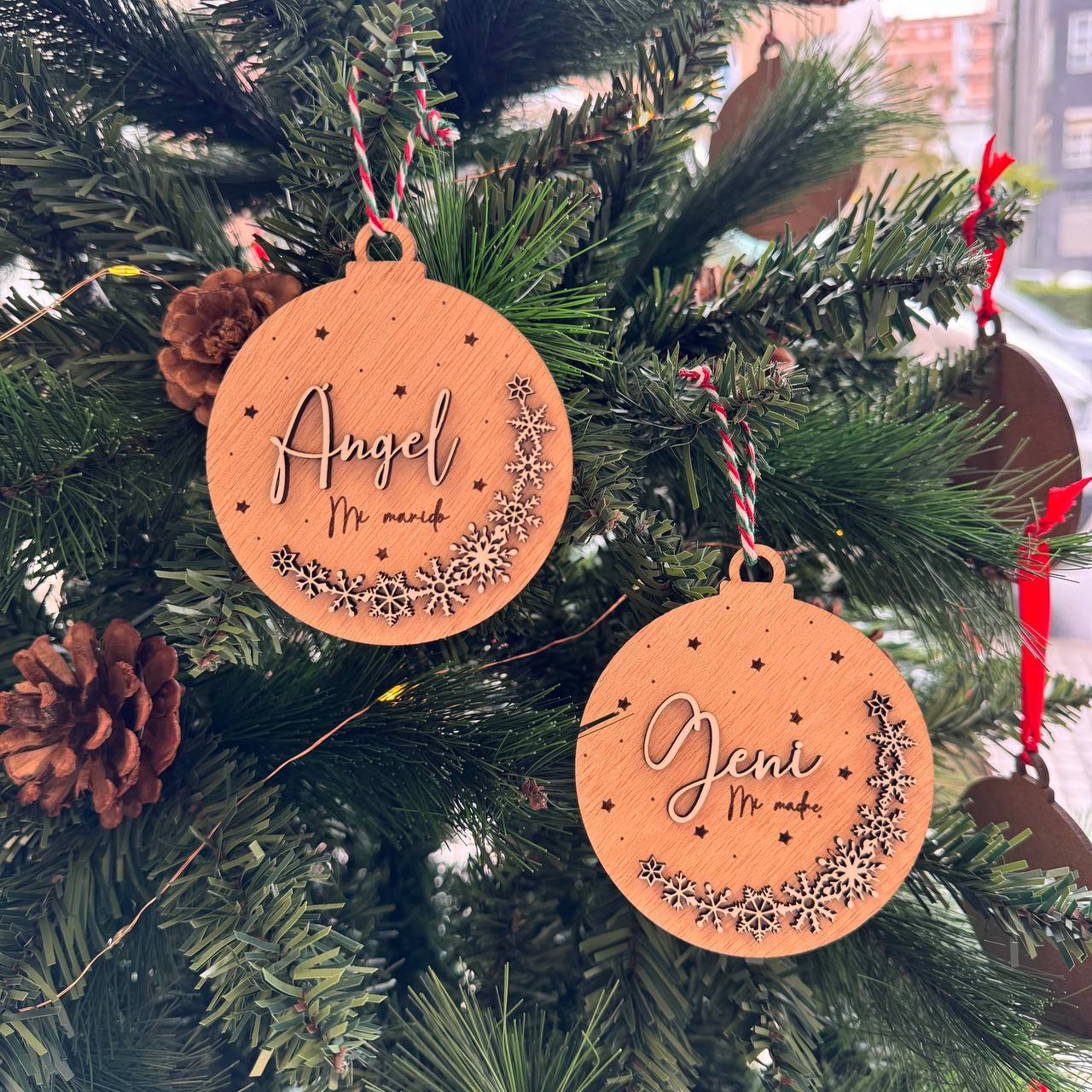 Madera de haya con adornos en madera blanca. Diseñadas en madera con mucho mimo y grabadas a láser, con una cinta para colgar.