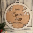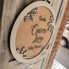 Madera de haya de 5mm de grosor, con adornos en madera blanca y 3 tipos de letra a elegir para los apellidos.