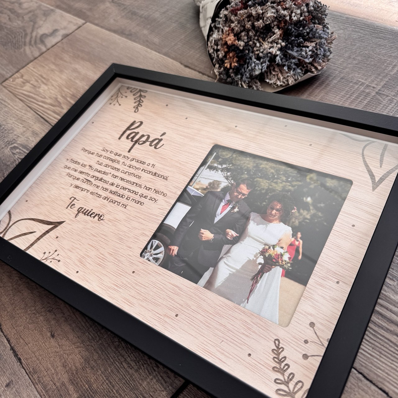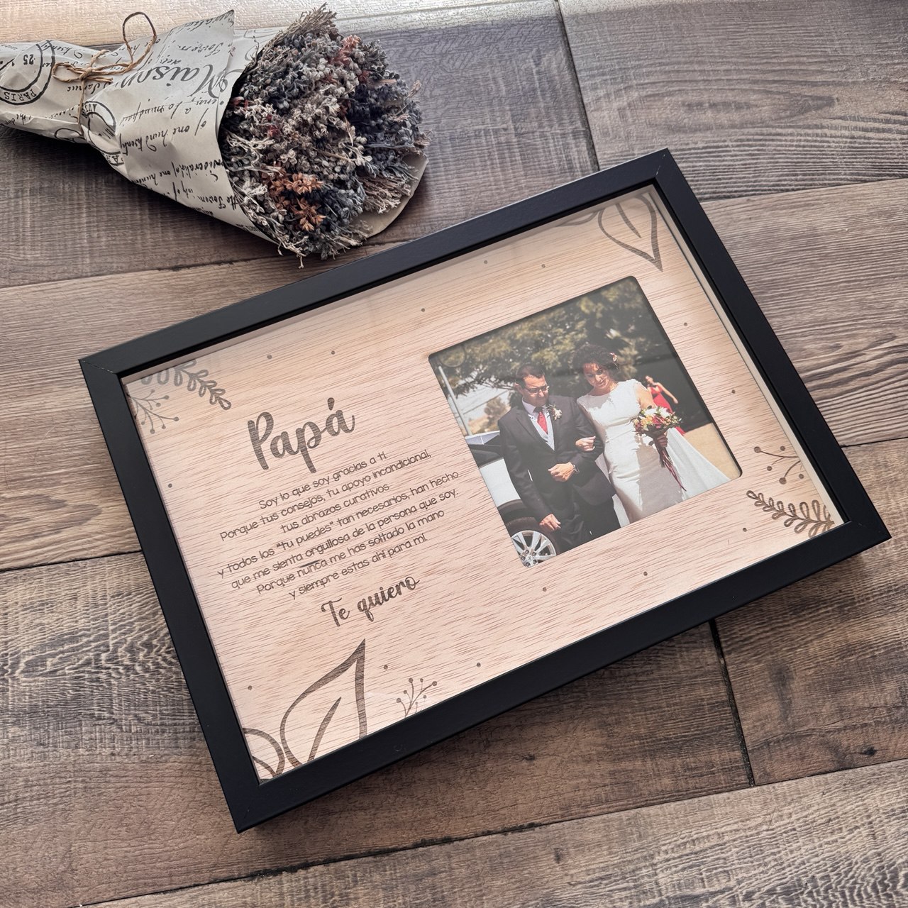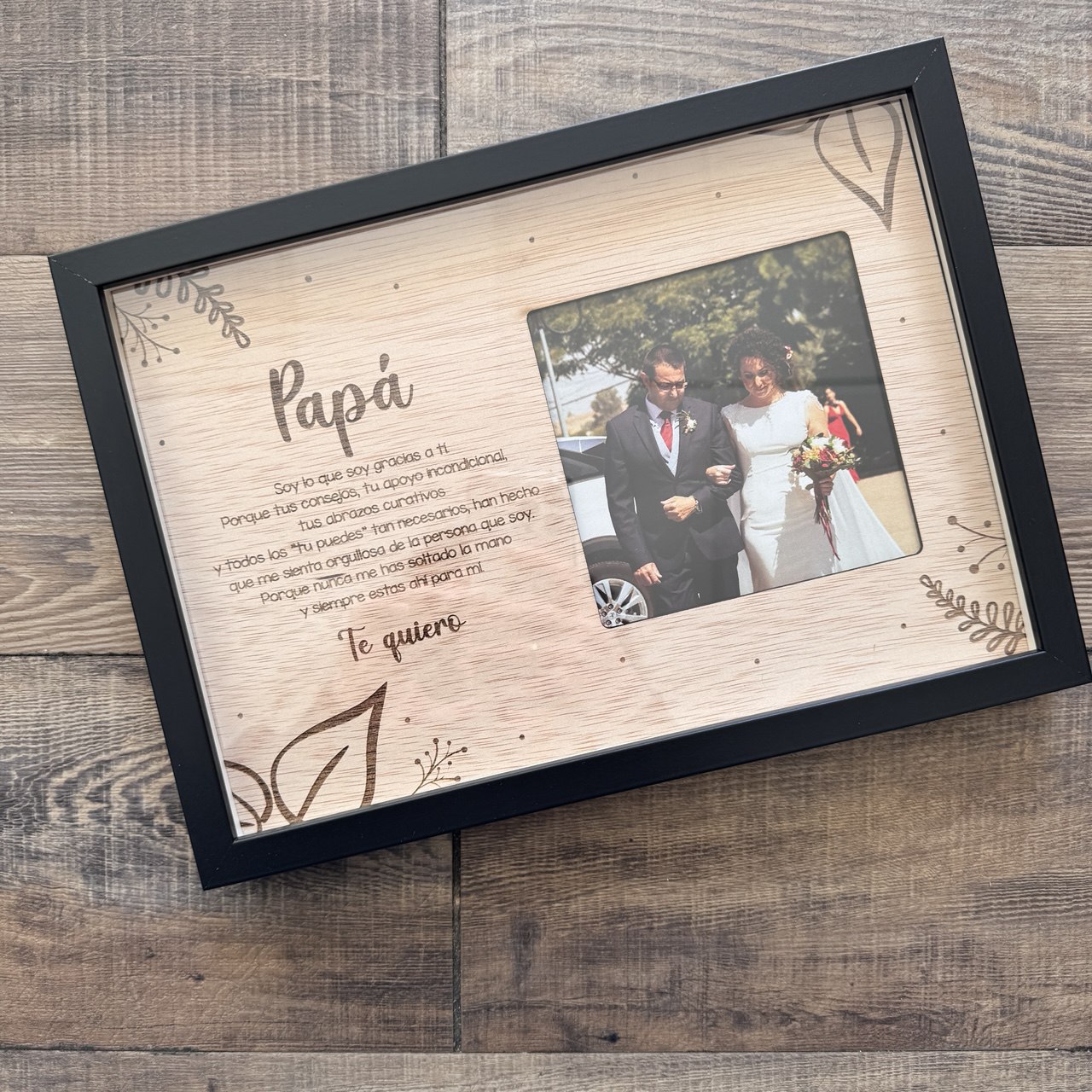Marco de madera de 21×30 cms, con madera de haya interior personalizada con mucho mimo. Te llega preparado para que le pongas la foto que más te guste una vez te llegue.